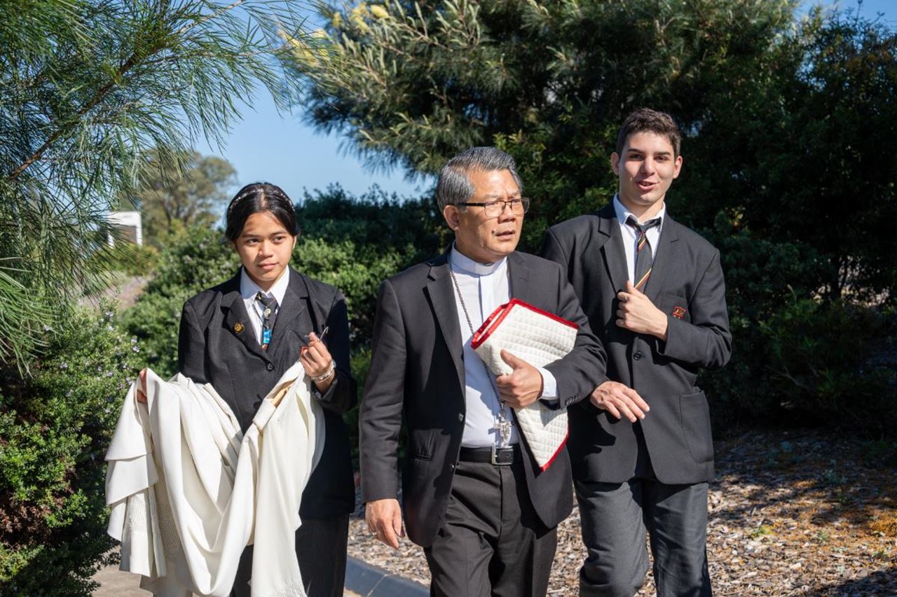 The Mass took place in the school’s “Town Square,” a space designed with a Franciscan theme inspired by the village of Assisi, Italy, home of the school’s namesake, St Clare. The school also honours its deep Aboriginal connections, recognising the site’s significance in local Aboriginal history.